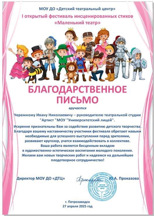 Студия «Артист» принимает активное участие во многих мероприятиях Лицея, таких как: «День учителя», «День матери», Новогодние спектакли, «День Победы», «8 марта» и другие.